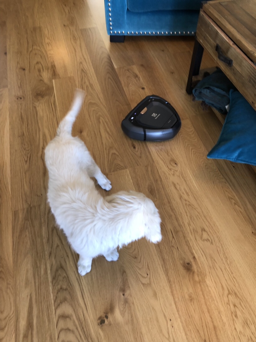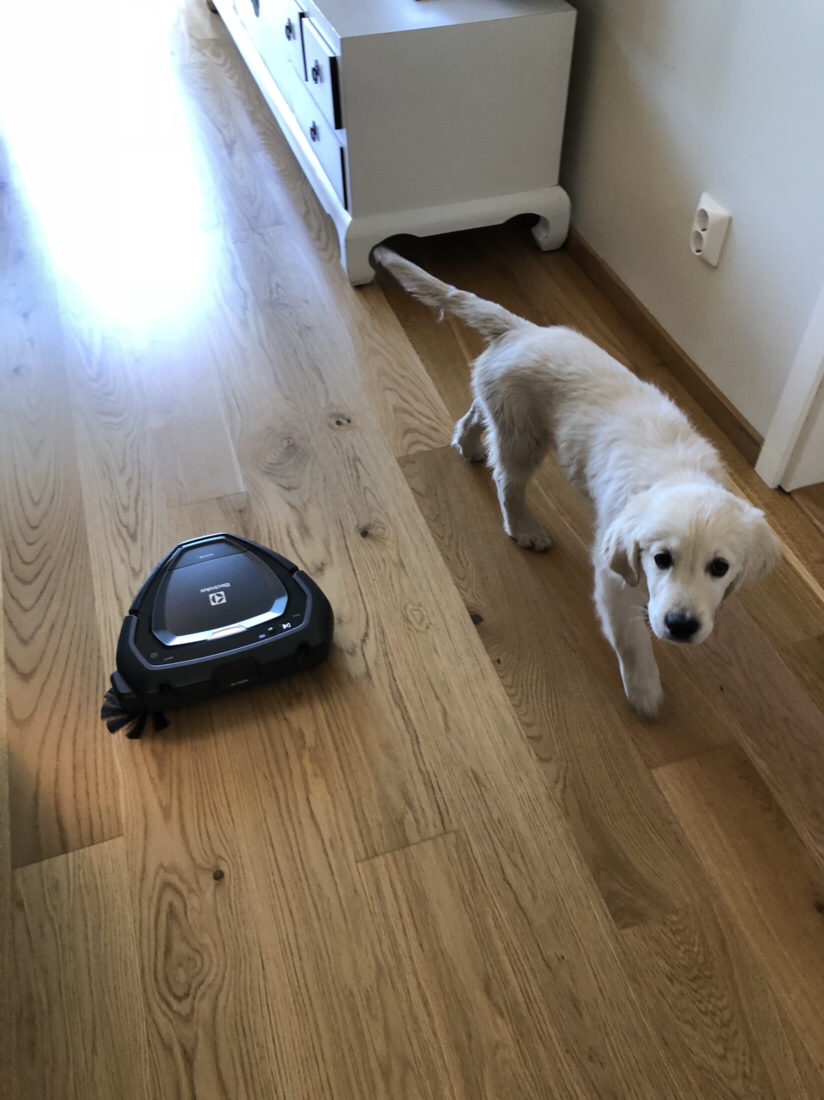 Lizzy har fått en ny kompis här hemma. Ett krav som jag ställde när vi skaffade hund var att vi skulle ha en självgående dammsugare. Anders satte sig lite på tvären men jag har varit med förr, nu dessutom med en långhårig hund. Orkar inte dammsuga ihjäl mig längre, jag är för gammal för sånt hahaha