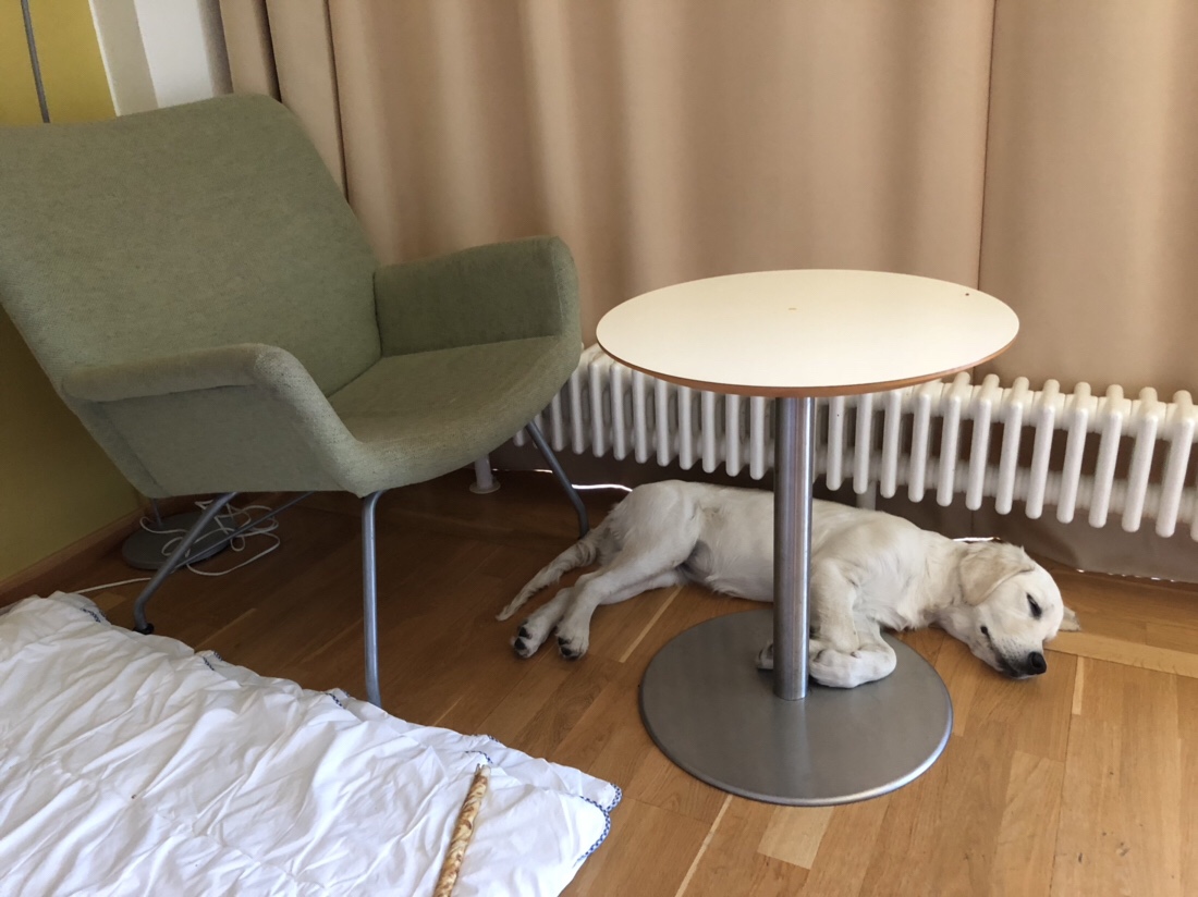 + trevligt rum, nära hissen, vattenskål och handduk till hund, nära till plats att rasta hunden på, fina promenadstråk. Kan tänka mig att bo där igen.